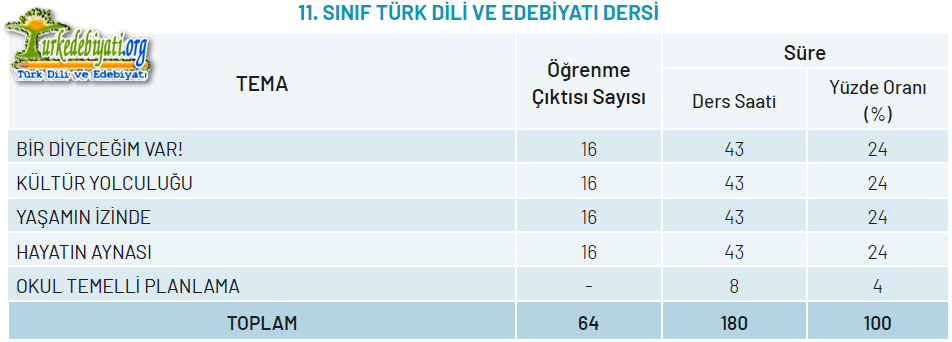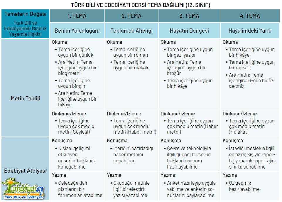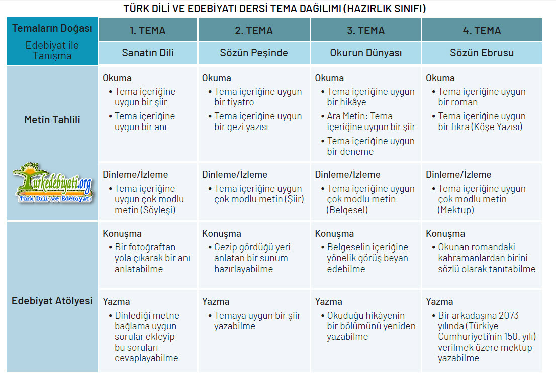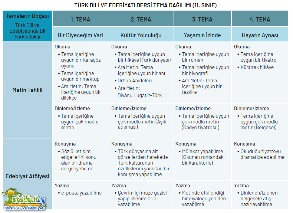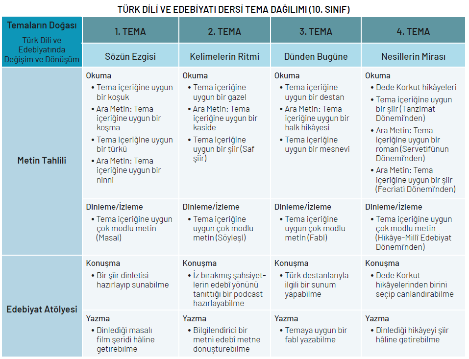 Türk Dili ve Edebiyatı dersinde öğrenme yaşantıları, öğrencinin okuma, dinleme/izleme, konuşma ve yazma becerilerini bir bütünlük içinde geliştirmeyi hedefler.