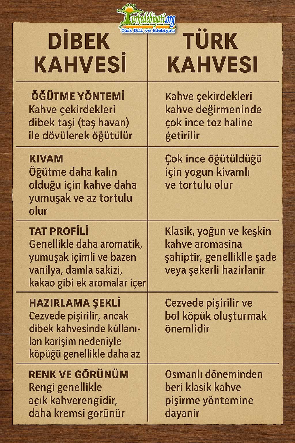 Dibek Kahvesi ile Türk Kahvesi arasındaki temel farkları gösteren bir tablo: