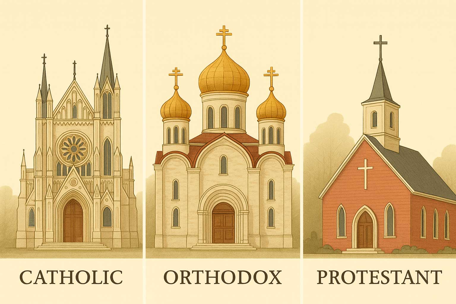 Katoliklik geleneksel yapıyı korurken, Ortodoksluk mistik yönü vurgular, Protestanlık ise bireysel iman özgürlüğünü öne çıkarır.