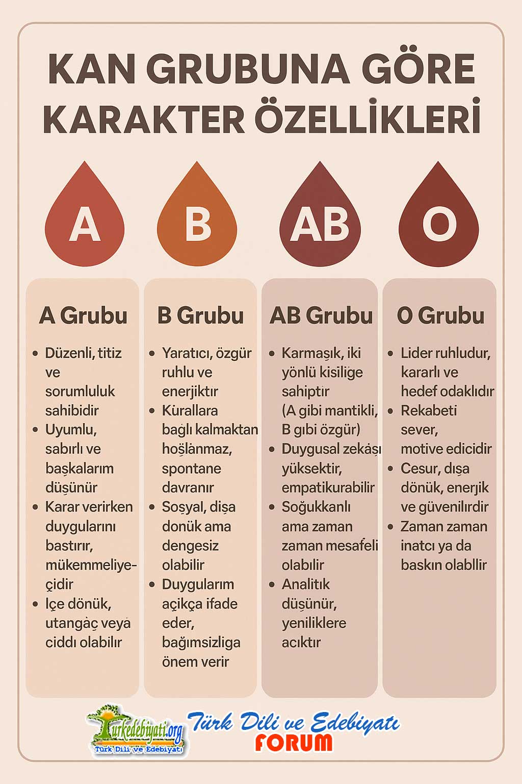 Her bir kan grubunun (A, B, AB ve 0) genel karakter özelliklerini,