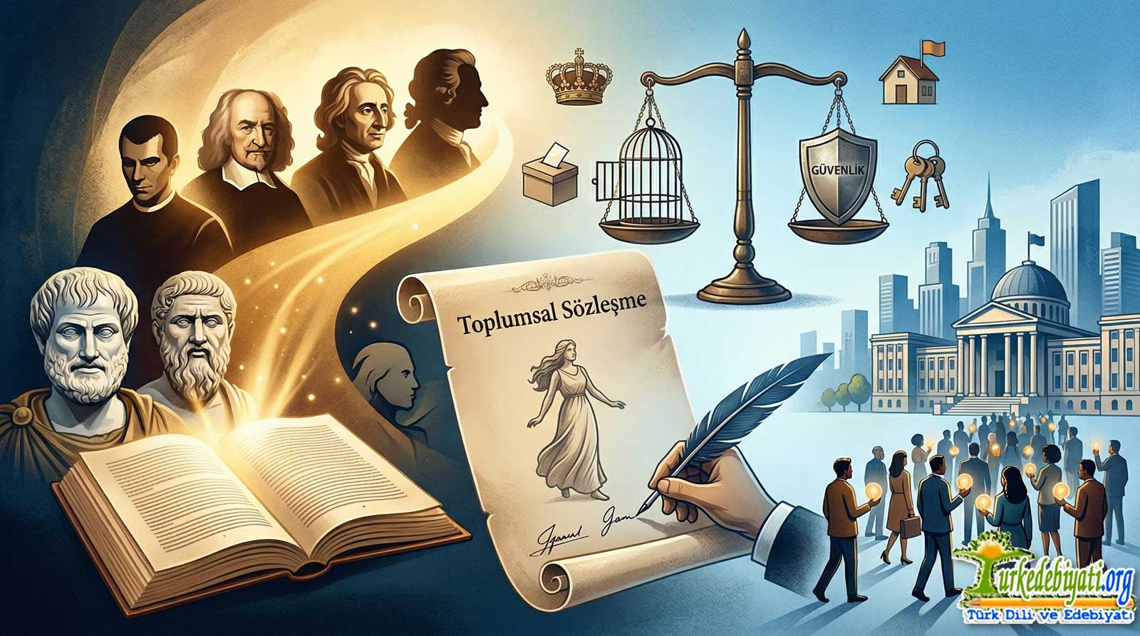 Modern siyaset felsefesinin en güçlü damarı “Toplumsal Sözleşme” (Social Contract) teorisidir. Bu teori, devletin doğal bir oluşum değil, insanların kendi rızalarıyla kurdukları yapay bir aygıt olduğunu savunur. Üç dev isim bu alanı şekillendirmiştir: